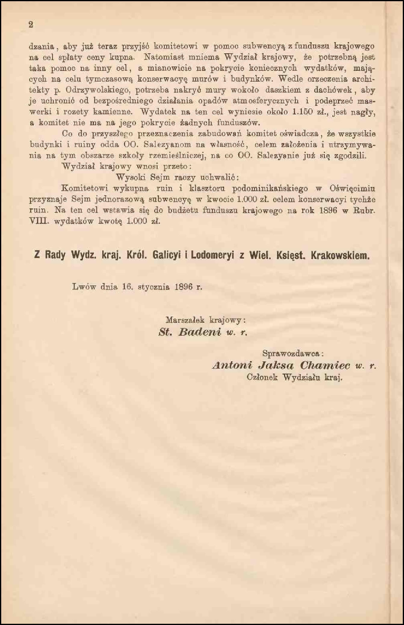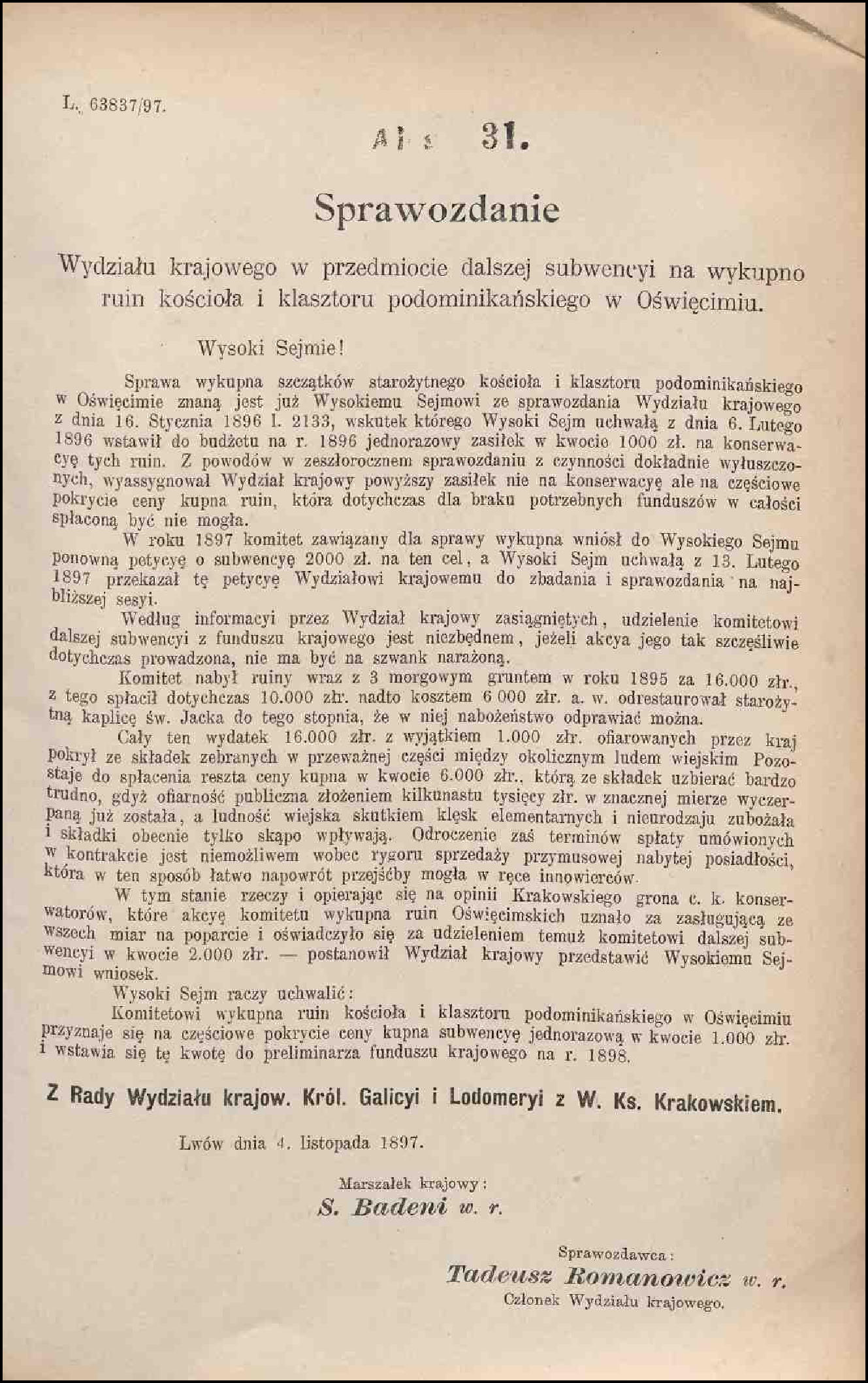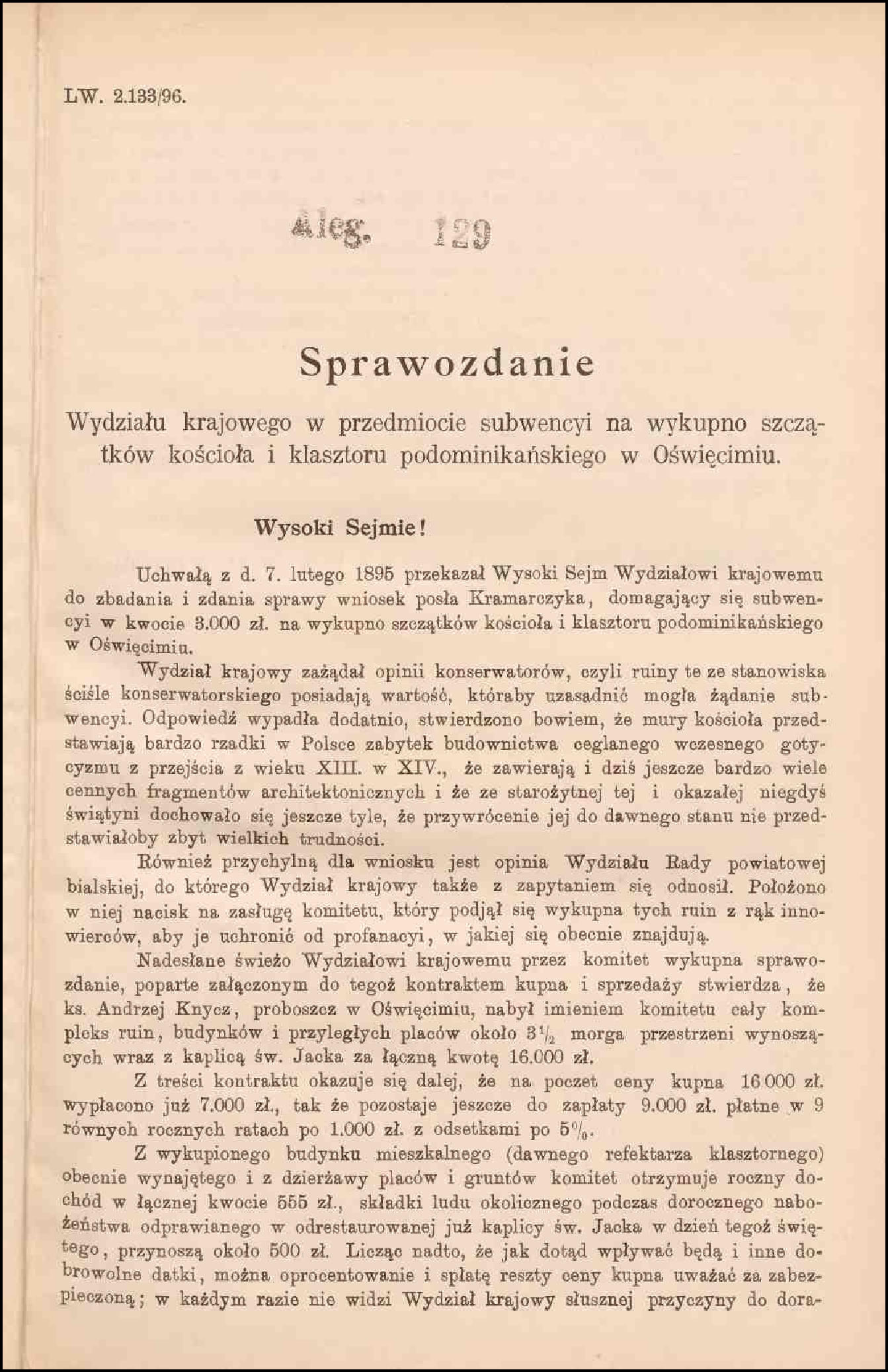 Po kasacji oświęcimskiego klasztoru dominikanów w roku 1816 i jego zupełnej likwidacji trzy lata później, zabudowania klasztorne wraz z należącym do nich kościołem pw. św. Krzyża zaczęły popadać w ruinę. Zaniedbane przez kolejnych właścicieli Kajetana Russockiego, Leokadię Dąbską oraz jej córkę Konstancję Sobolewską zostały ostatecznie sprzedane przez tą ostatnią w 1872 roku. Nabywcami byli żydowski kupiec Landau i przemysłowiec Schonker. Zniszczony już wcześniej kościół oraz kaplica św. Jacka uległy jeszcze dalszej dewastacji i profanacji przez urządzenie w nich stajni oraz składu szmat, węgla i nafty. Stan ten utrzymywał się do połowy roku 1894, kiedy to z inicjatywy ks. Andrzeja Knycza zawiązał się społeczny komitet, który objął sobie za cel wykup podominikańskich ruin i przywrócenie funkcji sakralnych kościoła oraz kaplicy. Koszt przedsięwzięcia wyniósł 16 tys. złotych reńskich i w znacznej większości został pokryty ze składek ludności. Pewien wkład finansowy wniosły również władze kraju koronnego Galicji i Lodomerii. Prezentowane poniżej dwa dokumenty, a dokładnie sprawozdania Wydziału Krajowego dla galicyjskiego Sejmu z roku 1896 i 1897 zawierają szereg szczegółowych informacji związanych z tym tematem. Dowiadujemy się z nich m.in, że: