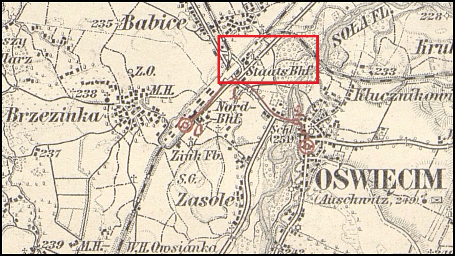 …Na przedstawianych powyżej wycinkach map okolic Oświęcimia zawierających ogólny zarys trasy kolejki, zauważyć można, że oprócz dworca kolejowego na terenie gminy Brzezinka (Nord-Bhf), na północny-wschód od niego, widnieje również oznaczenie drugiego dworca (Staats Bhf.). Nazwę tego pierwszego można tłumaczyć jako „Dworzec Północny”, choć bardziej poprawną formą byłoby „Dworzec Kolei Północnej” z uwagi na fakt, że powstał on w ramach „Kolei Północnej Cesarza Ferdynanda” z Wiednia do Krakowa. Na tej samej zasadzie nazwa drugiego obiektu – „Dworzec Państwowy” (Staats Bahnhof) mogła się wziąć od „Kolei Państwowej Karola Ludwika” wiodącej z Oświęcimia do Podgórza. Rzeczywiście według mapy znajdował się on w miejscu, gdzie łączyły się obie linie kolejowe. Problematyczne pozostaje zagadnienie braku jakichkolwiek źródeł na jego temat, względnie ewentualne źródła mogły nie być kojarzone z nim, ale z „Dworcem Kolei Północnej”. Zastanawiający jest również brak większych zabudowań w tym miejscu (obecnie na tym terenie znajduje się jeden stary piętrowy obiekt – przy wiadukcie i nowopowstały market budowlany). Można postawić jeszcze jedną tezę, że ten sam budynek mógł być dworcem w ramach obu wspomnianych linii kolejowych, a tylko z prozaicznego powodu braku miejsca na mapie, jej autor nazwę „Staats Bhf.” umieścił nieco wyżej. Dowodem na jej potwierdzenie są dwa fragmenty załącznika nr 1 projektu, gdzie w kontekście dworca określenie „Staatsbahn” pojawia się w nawiasie zaraz obok „Nordbahn”: