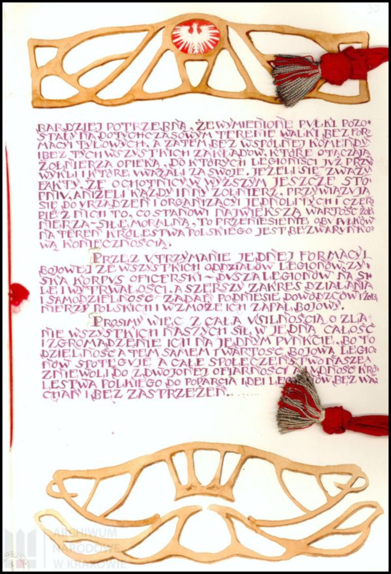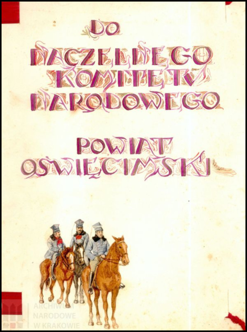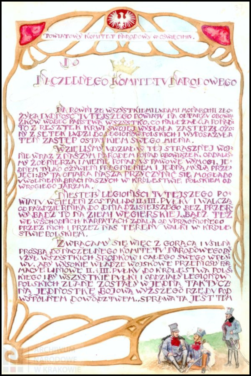 Przeglądając stronę internetową Archiwum Narodowego w Krakowie natrafimy na opublikowaną kilka lat temu wystawę online pt. „W drodze do Niepodległej”. Co kryje się pośród prezentowanych skanów? A no nie lada gratka dla poszukiwaczy wszelkich śladów oświęcimskiej historii legionowej – pięknie zdobiony, trzy-stronicowy dokument, Odezwa Powiatowego Komitetu Narodowego w Oświęcimiu do Naczelnego Komitetu Narodowego z 1915 roku, należąca do zbioru profesora Teofila Klimy (sygn. 29/680/12). Nie mogłem oprzeć się, aby nie umieścić go na swojej stronie. Czyniąc zadość wymogom formalnym zamieszczam również odnośnik do strony źródłowej (LINK).
