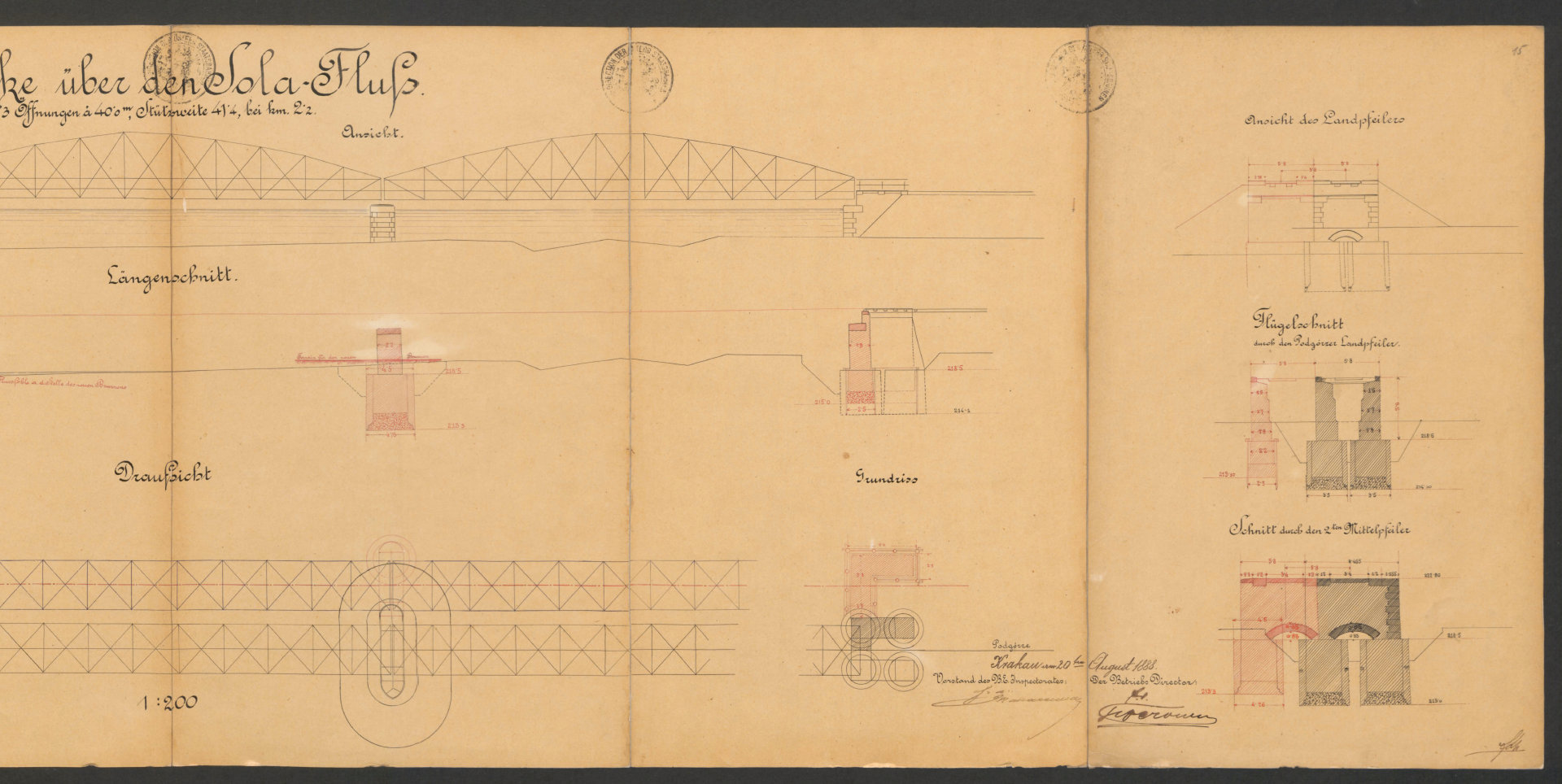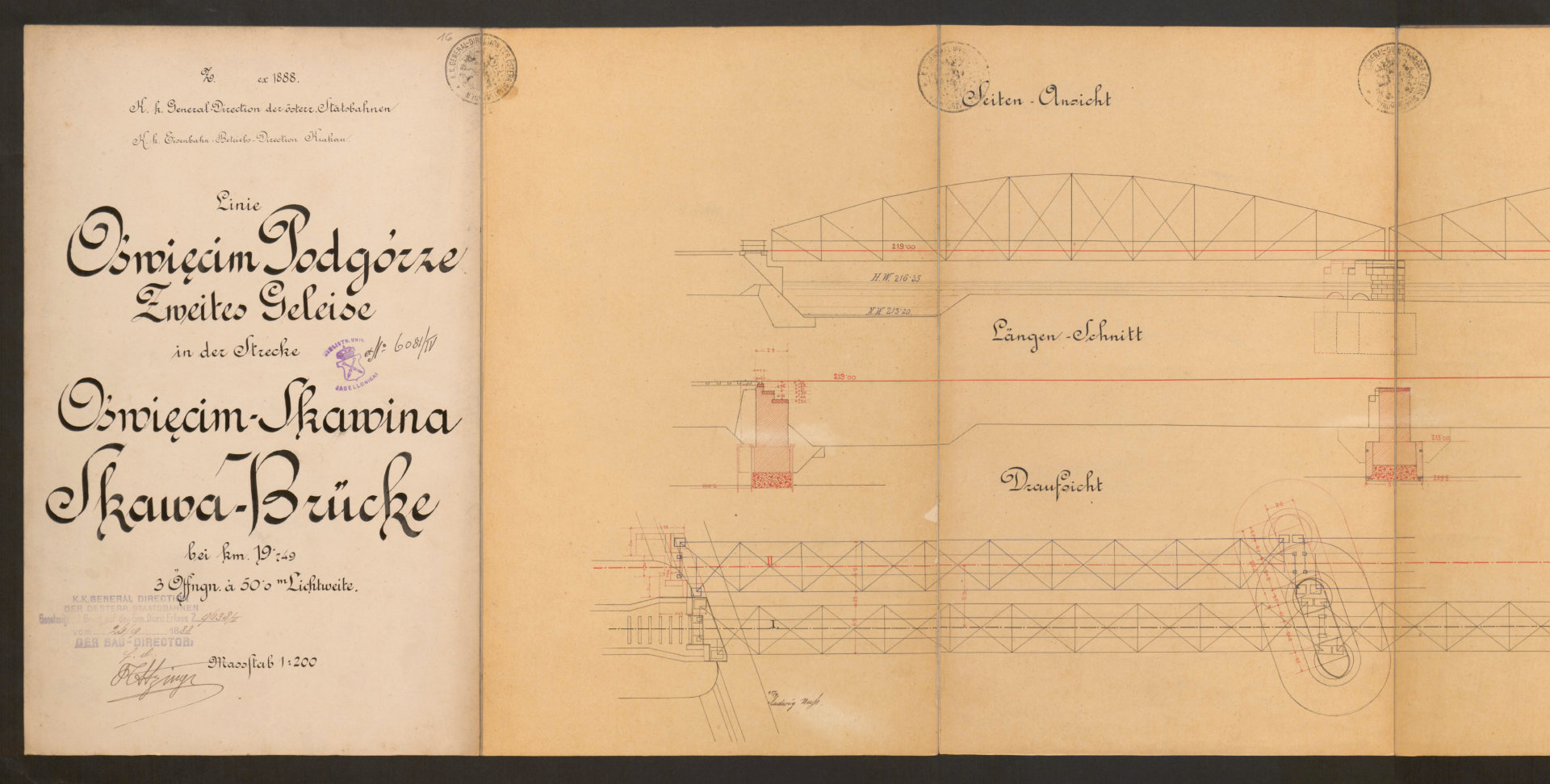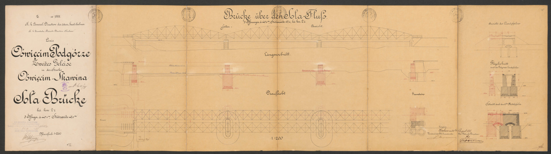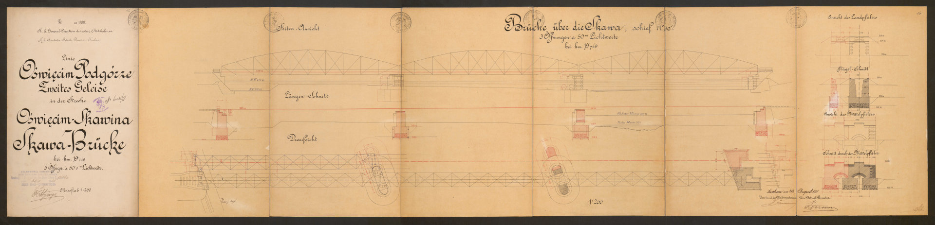 W mojej opowieści o kolei w Oświęcimiu brakuje jeszcze jednego istotnego elementu, a mianowicie mostów. Przypomnę, że pierwszą linię kolejową doprowadzono do Oświęcimia w 1856 roku (trasa Wiedeń-Trzebinia-Kraków), a drugą w roku 1863 z kierunku Mysłowic. Natomiast 21 lat później powstała kolejna inwestycja, jaką była trasa prowadząca z Podgórza do Oświęcimia (w ramach Galicyjskiej Kolei Transwersalnej). Ale… zanim pierwszy pociąg z tego kierunku mógł wjechać na oświęcimski dworzec, należało wybudować dwa mosty kolejowe: jeden na rzece Skawie w pobliżu Zatora i drugi na Sole nieco na północ od Oświęcimia. Udało mi się odnaleźć plany obu konstrukcji. Co ciekawe, daty umieszczone na tych dokumentach prowadzą do wniosku, że nie stanowiły one raczej części projektu budowlanego. Oba pochodzą z 1888 roku, a więc sporządzono je 4 lata później niż zakończono budowę trzeciej linii (z Podgórza). Być może stanowiły rodzaj dokumentacji powykonawczej? Skany przedstawiam poniżej. Z uwagi na rozmiar zostały one podzielone na mniejsze części, tak aby łatwiej dostrzec szczegóły. Pochodzą one z zasobów Jagiellońskiej Biblioteki Cyfrowej (LINK).