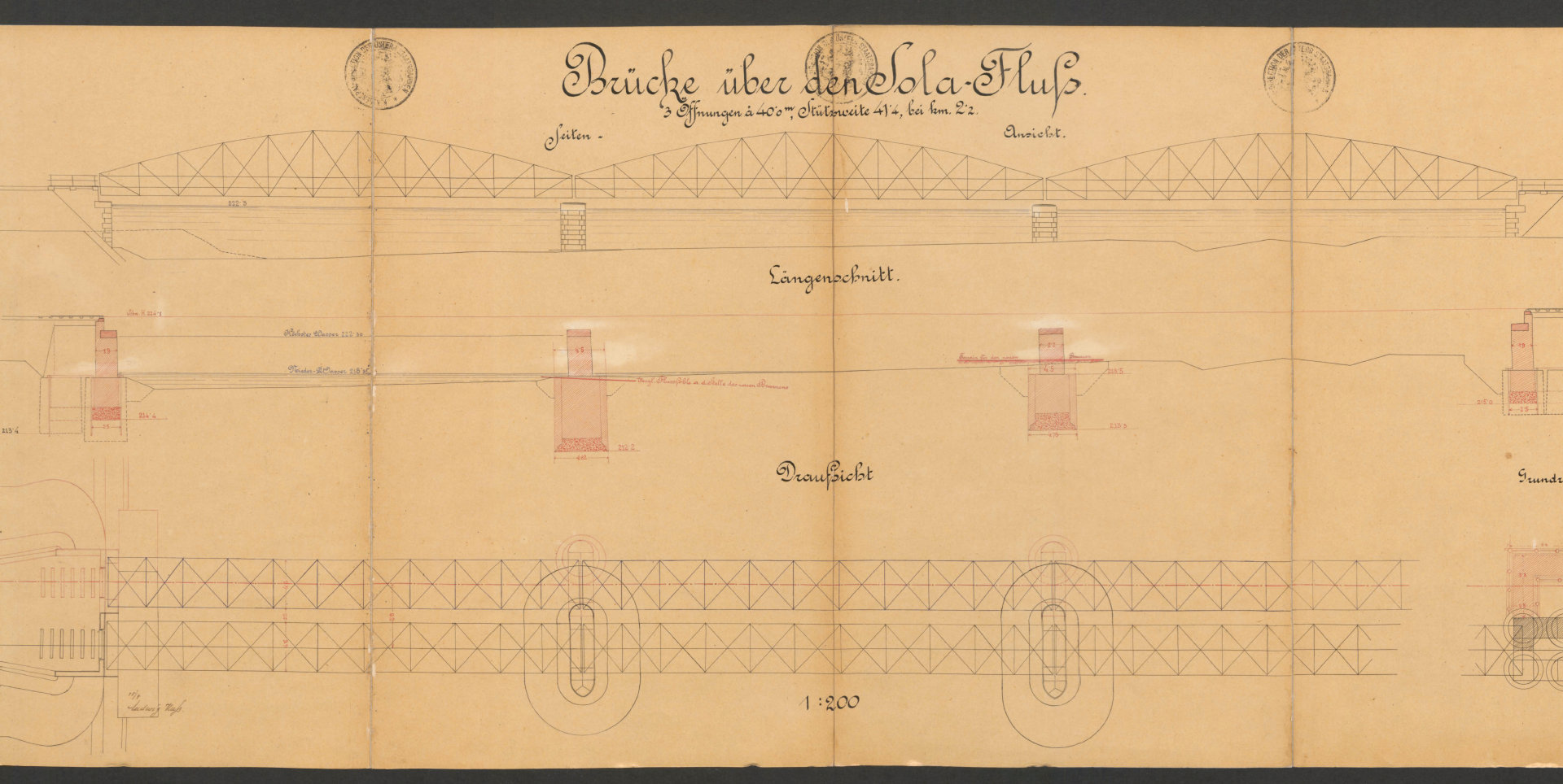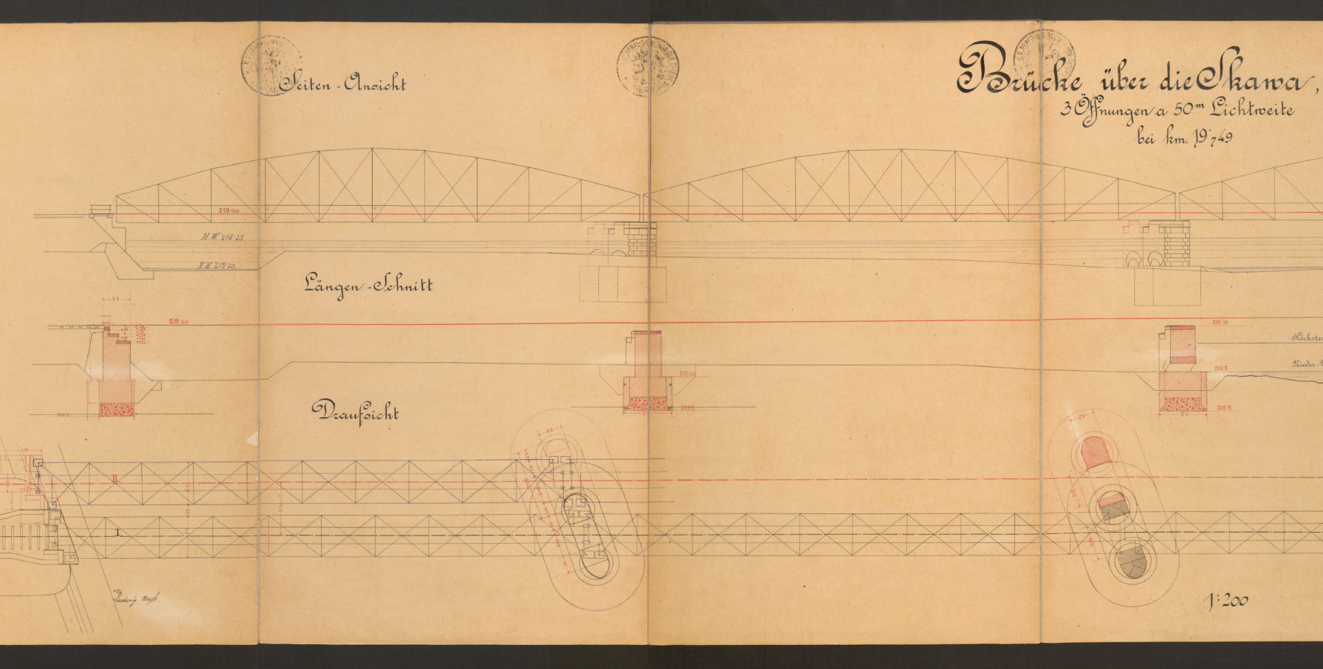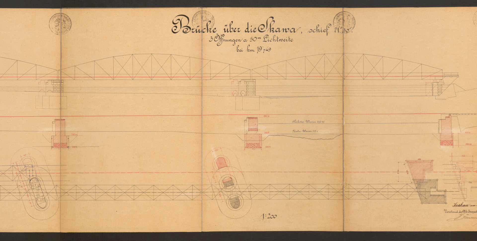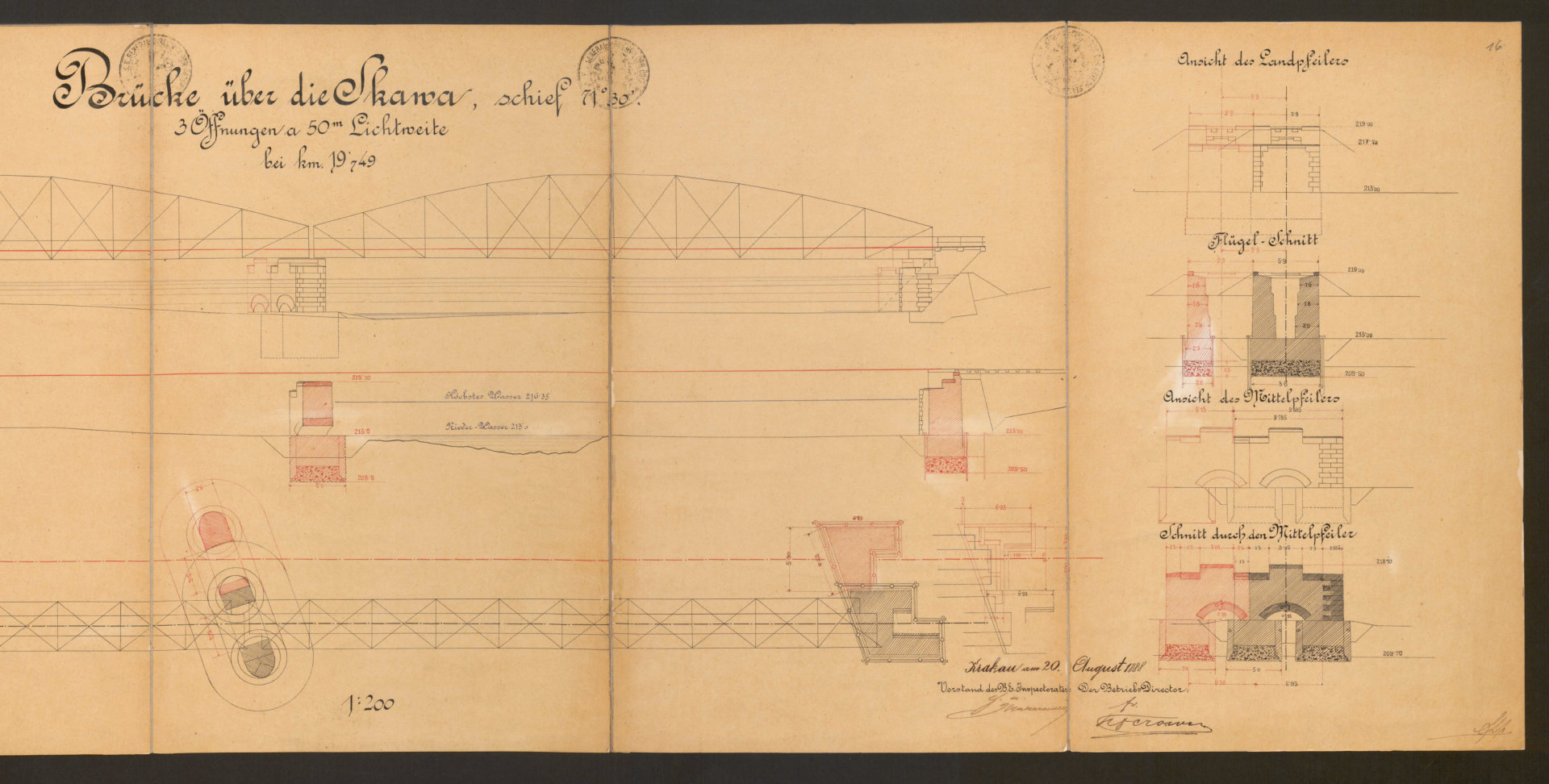 W mojej opowieści o kolei w Oświęcimiu brakuje jeszcze jednego istotnego elementu, a mianowicie mostów. Przypomnę, że pierwszą linię kolejową doprowadzono do Oświęcimia w 1856 roku (trasa Wiedeń-Trzebinia-Kraków), a drugą w roku 1863 z kierunku Mysłowic. Natomiast 21 lat później powstała kolejna inwestycja, jaką była trasa prowadząca z Podgórza do Oświęcimia (w ramach Galicyjskiej Kolei Transwersalnej). Ale… zanim pierwszy pociąg z tego kierunku mógł wjechać na oświęcimski dworzec, należało wybudować dwa mosty kolejowe: jeden na rzece Skawie w pobliżu Zatora i drugi na Sole nieco na północ od Oświęcimia. Udało mi się odnaleźć plany obu konstrukcji. Co ciekawe, daty umieszczone na tych dokumentach prowadzą do wniosku, że nie stanowiły one raczej części projektu budowlanego. Oba pochodzą z 1888 roku, a więc sporządzono je 4 lata później niż zakończono budowę trzeciej linii (z Podgórza). Być może stanowiły rodzaj dokumentacji powykonawczej? Skany przedstawiam poniżej. Z uwagi na rozmiar zostały one podzielone na mniejsze części, tak aby łatwiej dostrzec szczegóły. Pochodzą one z zasobów Jagiellońskiej Biblioteki Cyfrowej (LINK).