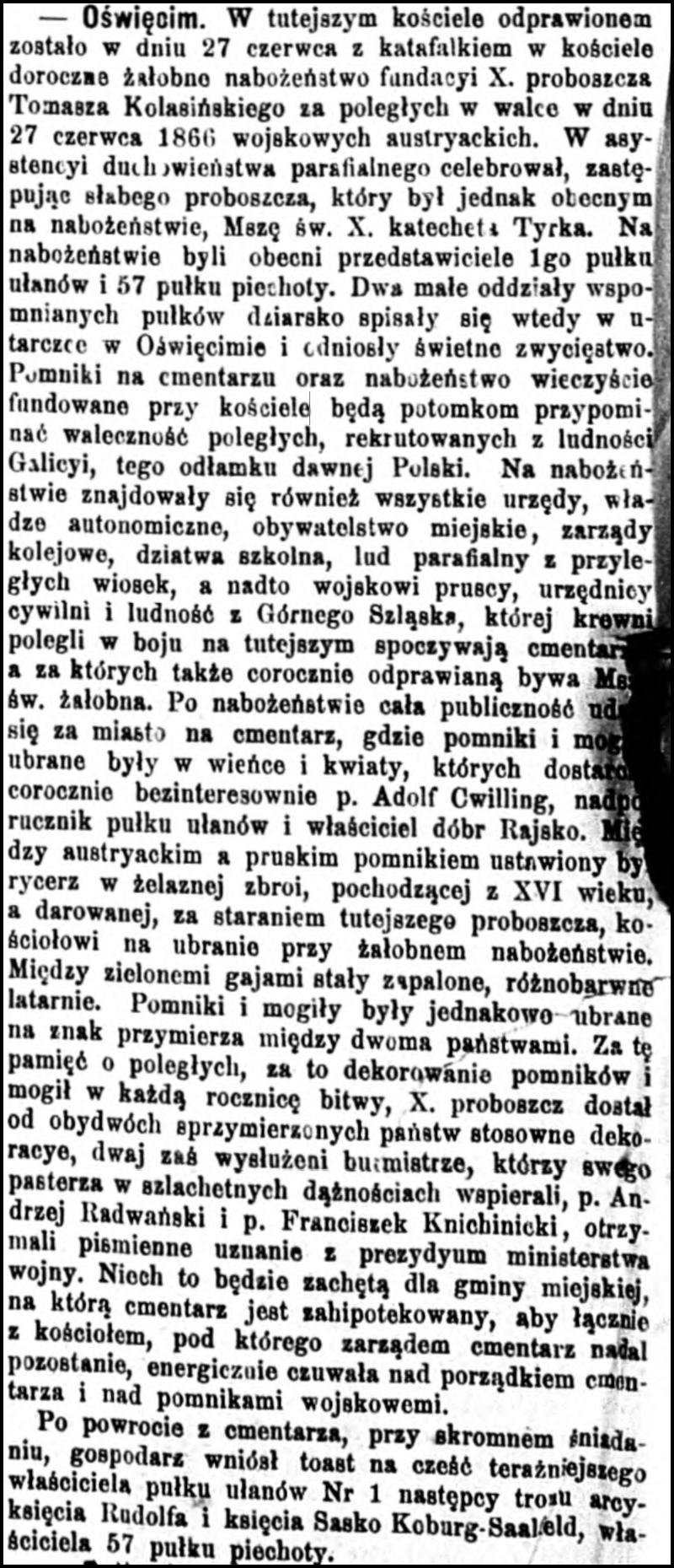 Z ciekawości przyjrzyjmy się, jak celebrowano nieco wcześniejszą, bo 22 rocznicę oświęcimskiej batalii. Wnikliwy opis znajdziemy w numerze 151 gazety „Czas” z 5 lipca 1888 roku. Zamieszczam go poniżej (oryginalny skan na stronie POLONA.PL -> LINK). Przy okazji odsyłam również do mojego posta z 2017 roku ze zdjęciami pomników, wspomnianych w poniższym tekście (LINK). Osobom pragnącym zgłębić szerzej omawiane zagadnienie polecam artykuł Aleksandra Babińskiego pt. POTYCZKA POD OŚWIĘCIMIEM.EPIZOD WOJNY PRUSKO-AUSTRIACKIEJ 1866 ROKU opublikowany kilka lat temu w „Roczniku Biblioteki Naukowej PAU i PAN w Krakowie” (LINK).