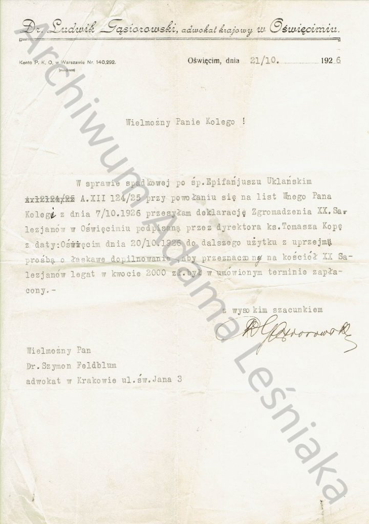 Poniżej przedstawiam dwa pisma, które wyszły z biura oświęcimskiego adwokata dr. Ludwika Gąsiorowskiego. Pochodzą one z lat 1926-1927 i dotyczą przekazania (części?) spadku po Epifaniuszu Uklańskim na rzecz księży Salezjanów z Oświęcimia w kwocie 2000 zł.