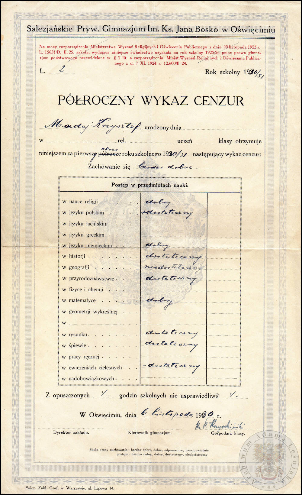 Tytuł obiektu: Świadectwo: Salezjanie – prywatne gimnazjum [Oświęcim, 1930]