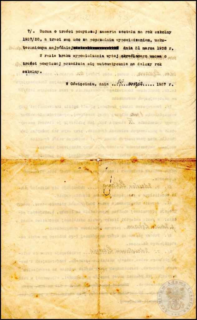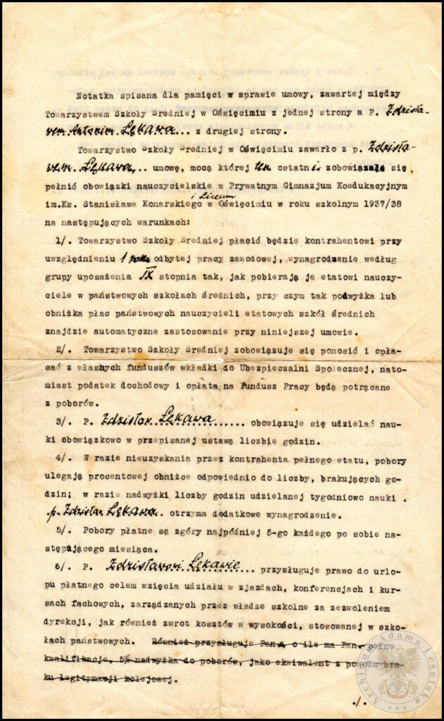 …dla pamięci w sprawie umowy zawartej pomiędzy Towarzystwem Szkoły Średniej w Oświęcimiu (…), a Zdzisławem Antonim Łękawa (…), mocą której ten ostatni zobowiązał się pełnić obowiązki nauczycielskie w Prywatnym Gimnazjum Koedukacyjnym im. Ks. Stanisława Konarskiego i Liceum w Oświęcimiu.