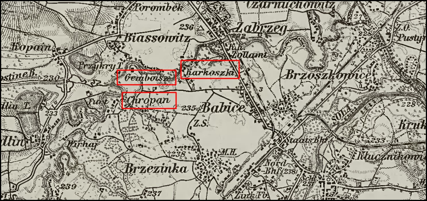 Nie ukrywam, że Zabrzeg sprawia mi pewien problem. Nie ma wątpliwości co do wsi Zabrzeg po pruskiej stronie Wisły (obecnie część Bierunia). Jednak nie znalazłem ani jednej mapy z ukazaniem Zabrzegu jako części Babic po wschodniej stronie Wisły. Pojawia się natomiast Chropań, czyli zachodnia część wsi. Oznaczyłem go na poniższym wycinku mapy (wydanej w 1914 roku) wraz z dwoma przysiółkami, których nazwy pochodzą od nazwisk właścicieli gruntów (źródło: „Myslowitz und Oświęcim : Zone 5 Col. XX.”, Śląska Biblioteka Cyfrowa, sbc.org.pl, LINK).