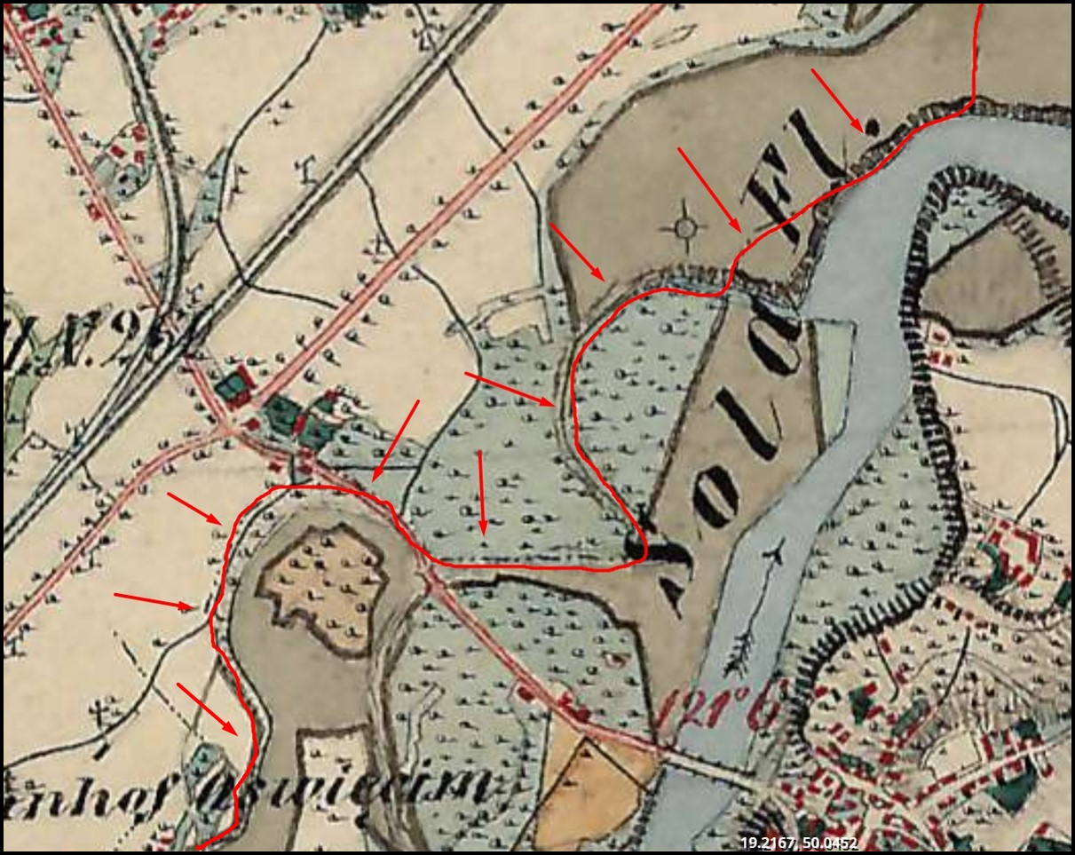 Sęk w tym, że po wielkich powodziach na początku XIX wieku Soła zmieniła swój bieg, a główne koryto przesunęło się bardziej na wschód, mniej więcej tak jak biegnie obecnie. A co z granicą? Pozostała tam gdzie była pierwotnie. Doskonale widać to na różnych XIX-wiecznych mapach. Poniżej wycinek z mapy powstałej w latach 60-tych XIX wieku (źródło: „Europe in the XIX. century”, maps.arcanum.com, LINK). Czerwoną linią oznaczyłem granicę oświęcimsko-babicką. Jak widać pokrywa się ona z dawnym korytem Soły. Natomiast granica względem „bieżącego” koryta rzeki jest zgodnie z tym co podaje Schneider – „cząstkowa”.