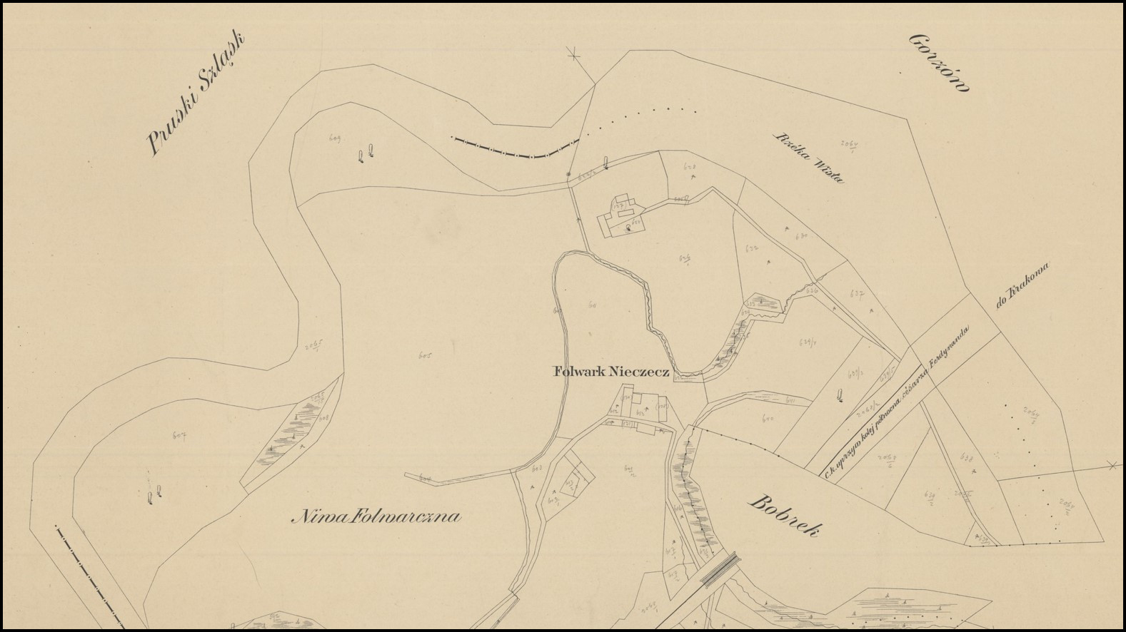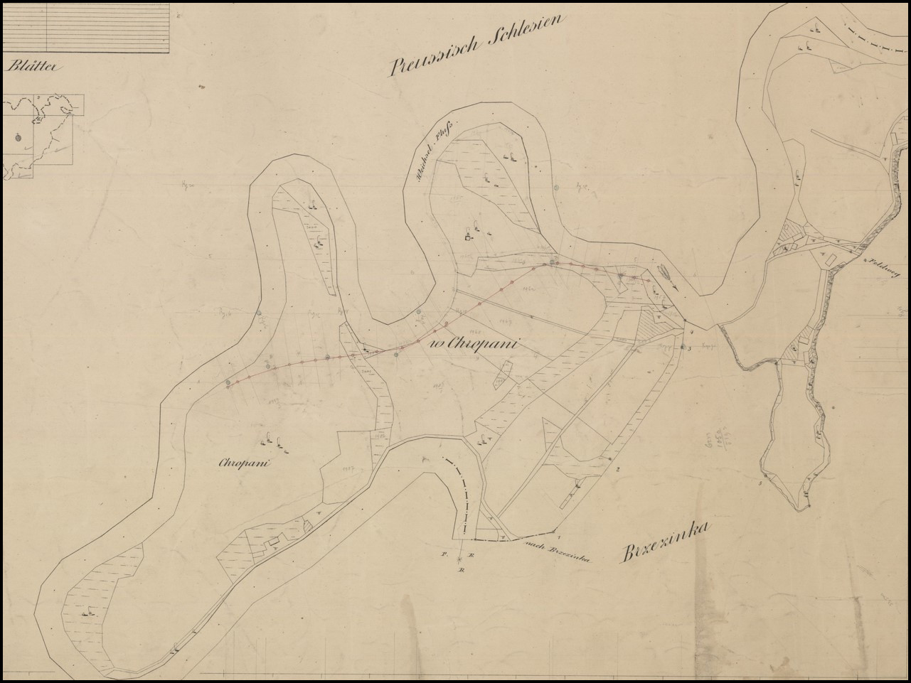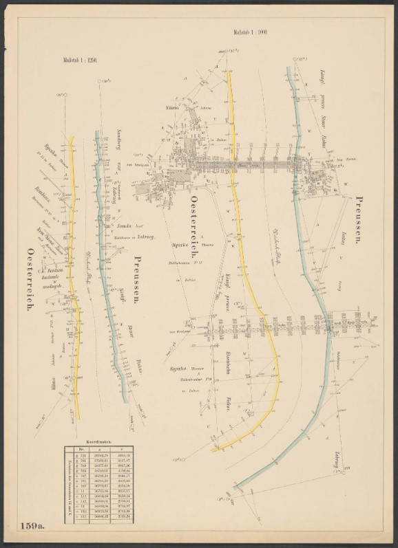 W zasadzie najmniej problemów sprawia granica z Prusami na Wiśle i nie ma się co na ten temat rozpisywać. Jako ciekawostkę mogę powiedzieć, że Muzeum Śląskie w Katowicach w swoich zbiorach posiada pochodzącą z 1895 roku mapę granicy prusko-austriackiej. Zaznaczono na niej m.in. nazwiska właścicieli działek nad rzeką. Poniżej jej poglądowy obraz w niskiej rozdzielczości (z powodów technicznych niestety). Szczegółowo można ją obejrzeć bezpośrednio na stronie muzeum (muzeumslaskie.pl).