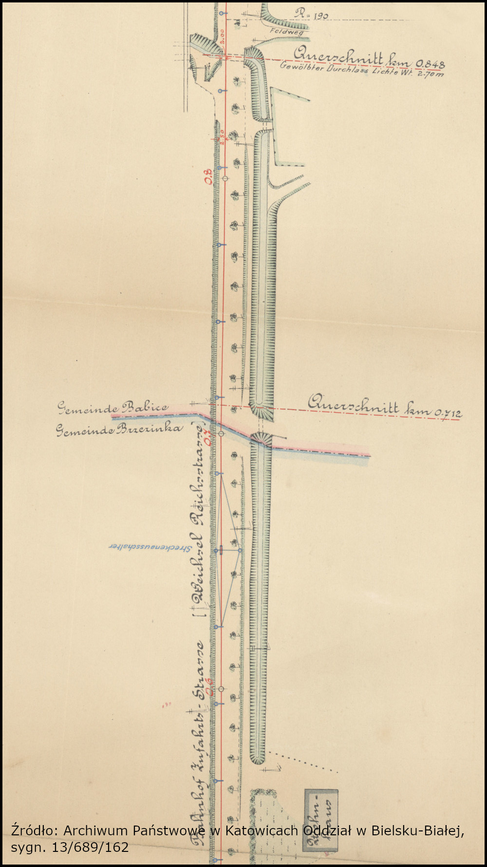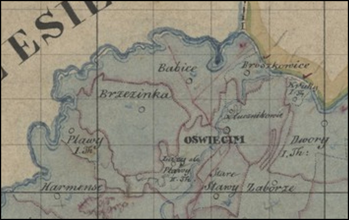 Większym wyzwaniem jest ustalenie, gdzie znajdowała się niegdyś (tzn. w XIX wieku) granica pomiędzy Babicami, a Brzezinką. Pamiętajmy bowiem, że w 1954 roku część wsi Babice włączono do Oświęcimia. Dlatego jako punkt odniesienia przyjmijmy obecną ulicę Powstańców Śląskich w Oświęcimiu (granica „w polach” nie jest aż tak ciekawa). W opublikowanym jakiś czasu opracowaniu na temat kolejki elektrycznej zamieściłem wycinki z mapy, na której wyrysowano planowaną trasę tej inwestycji (LINK). Na jednym z jej fragmentów zaznaczono również miejsce styku gmin Babice oraz Brzezinka (skan poniżej, źródło: Archiwum Państwowe w Katowicach Oddział w Bielsku-Białej, sygn. 13/689/162).