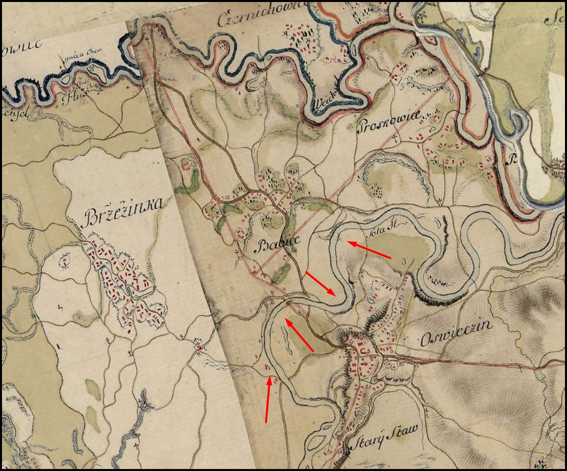 O wiele bardziej zagadkowo jawi się dawna granica pomiędzy Oświęcimiem i Babicami. Nie ulega wątpliwości, że przed wiekami, obie miejscowości rozgraniczała rzeka Soła. Istotny jest fakt, że jeszcze dwa i pół wieku temu jej główne koryto znajdowało się nieco bardziej na zachód niż obecnie. Doskonale widać to na pochodzącej z początku lat 80-tych XVIII wieku, tzw. mapie Miega (czy też chcąc być bardziej precyzyjnym: „Josephinische Landesaufnahme” – pierwsze kartograficzne zdjęcie wojskowe monarchii Habsburgów). Jej skany są dostępne online (maps.arcanum.com, LINK). Poniżej stosowny wycinek, na którym oznaczyłem dawne koryto Soły.