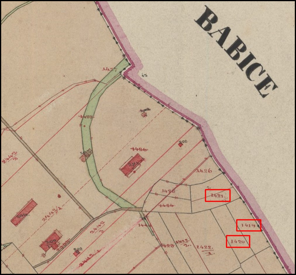 Problem polega jednak na tym, że powyższe wskazanie jest mało precyzyjne. W takich przypadkach uciekam się do bardziej dokładnych źródeł, jakim są mapy katastralne, albowiem numery wielu działek pozostały niezmienione po dziś dzień. Spośród dostępnych online map katastru galicyjskiego z 1845 roku (zob. „Szukaj w archiwach” – LINK) niestety nie znajdziemy „naszych” pod oświęcimskich Babic. Ale… na szczęście przynajmniej jest mapa Brzezinki (źródło: Archiwum Narodowe w Krakowie, sygn. 29/280/3105, szukajwarchiwach.pl, LINK). Spójrzmy teraz na jej północno-wschodni fragment i działki o numerach 1419, 1420, 1421 (oznaczyłem je czerwoną ramką).