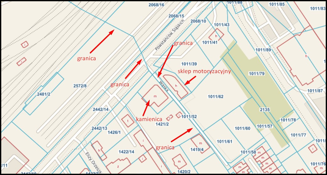 Teraz wystarczy rzucić okiem na współczesną mapę Oświęcimia, na której znajdziemy numery działek i voilà! Wskazane wyżej parcele położone są po zachodniej stronie ulicy Wąskiej. Jest to (nomen omen) wąska uliczka pomiędzy obecnym sklepem motoryzacyjnym i dużą trzypiętrową kamienicą pod adresem „ul. Wąska 3”. Mapa poniżej przedstawia współczesne umiejscowienie dawnej granicy pomiędzy wioskami (gminami) Babice i Brzezinka (opracowanie własne na podstawie geodezyjnej mapy online udostępnionej przez „System Informacji Przestrzennej Urzędu Gminy Oświęcim”, oswiecim.e-mapa.net, LINK).