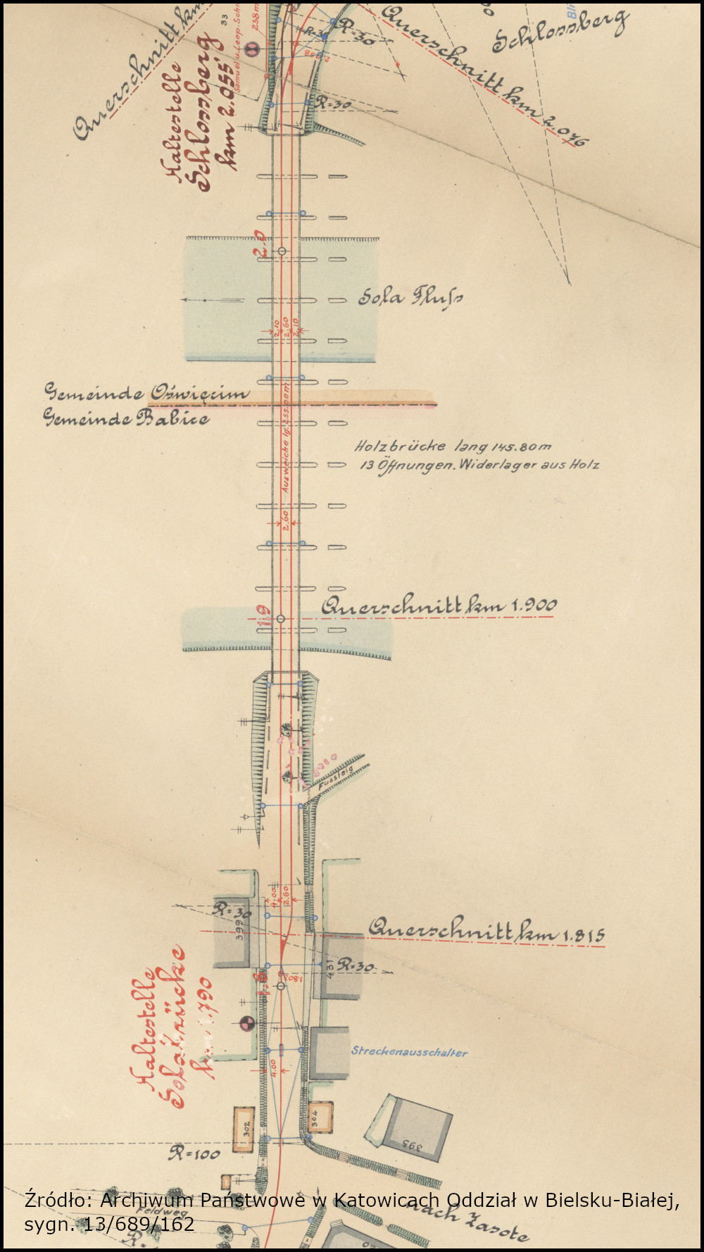 Zapewne zadowoliłbym się tą informacją i na niej poprzestał, gdyby nie jeden drobny szczegół. Na wspomnianym już wyżej projekcie kolejki elektrycznej z 1908 roku, granica pomiędzy Oświęcimiem, a Babicami zaznaczona jest po środku mostu na Sole (skan poniżej, źródło: Archiwum Państwowe w Katowicach Oddział w Bielsku-Białej, sygn. 13/689/162). Szczerze wątpię, abyśmy mieli do czynienia z błędem na mapie. Wszystko wskazuje na to, że w drugiej połowie, względnie pod koniec XIX wieku, omawiana granica musiała przesunąć się na zachód. Jest to teza, którą stawiam i będę dążył do jej udowodnienia w najbliższej przyszłości. Cóż… potrzeba więcej map 🙂 Nie wszystkie są dostępne online.
