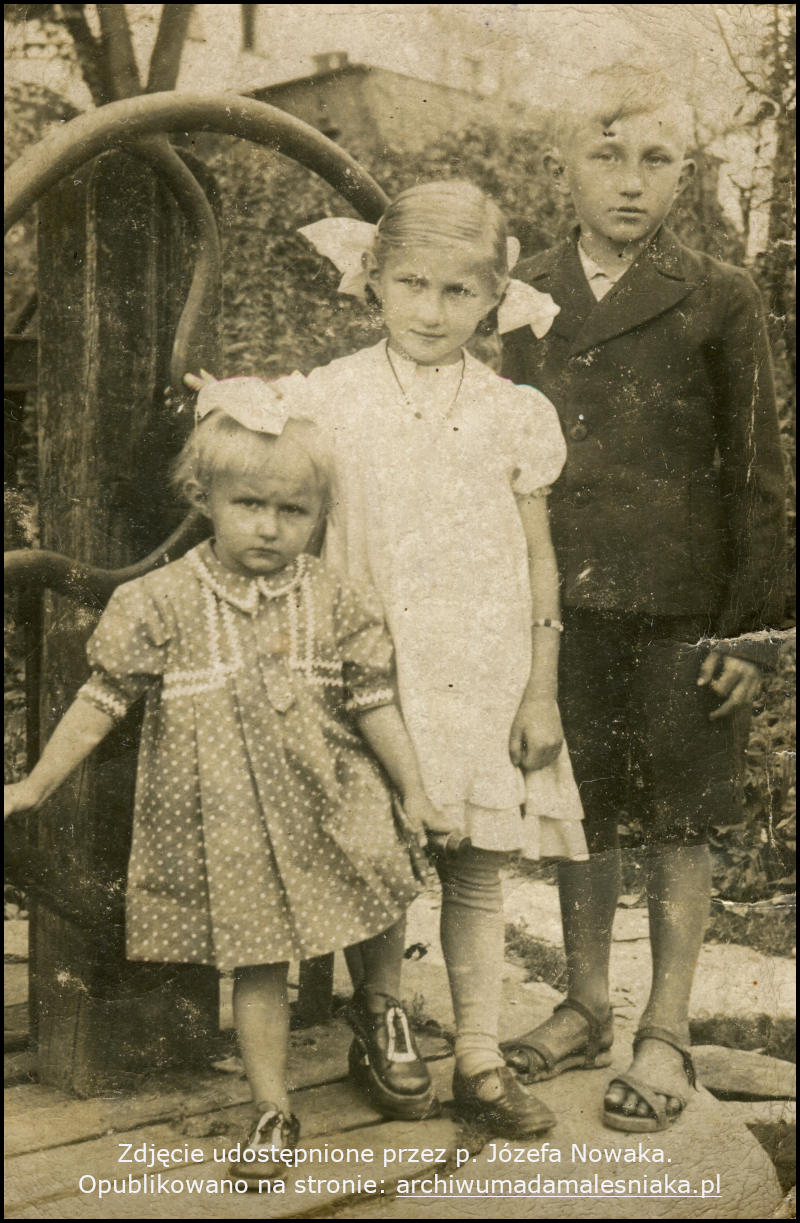 Zdjęcie nr 1. Józef Nowak ze swoimi siostrami przy studni Karolusów za domem na ul. Jagiełły: