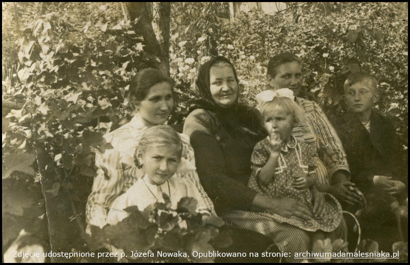Zdjęcie nr 3. W ogrodzie Karolusów za domem na ul. Jagiełły. Dorośli od lewej: Karolina Karolus (moja prababcia), Julia Nowak (matka Józefa), Waleria Jurzak (siostra Karoliny), siostra Julii Nowak. Dzieci to Józef Nowak z siostrami.