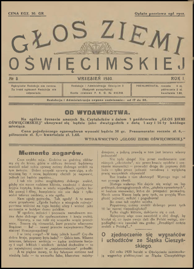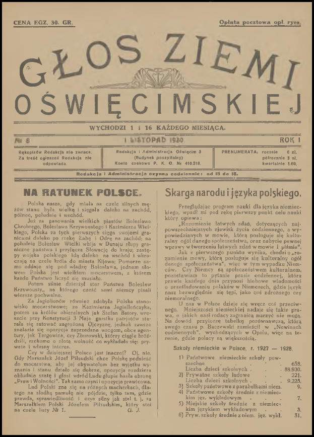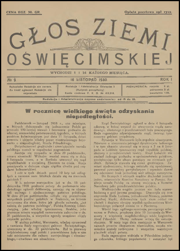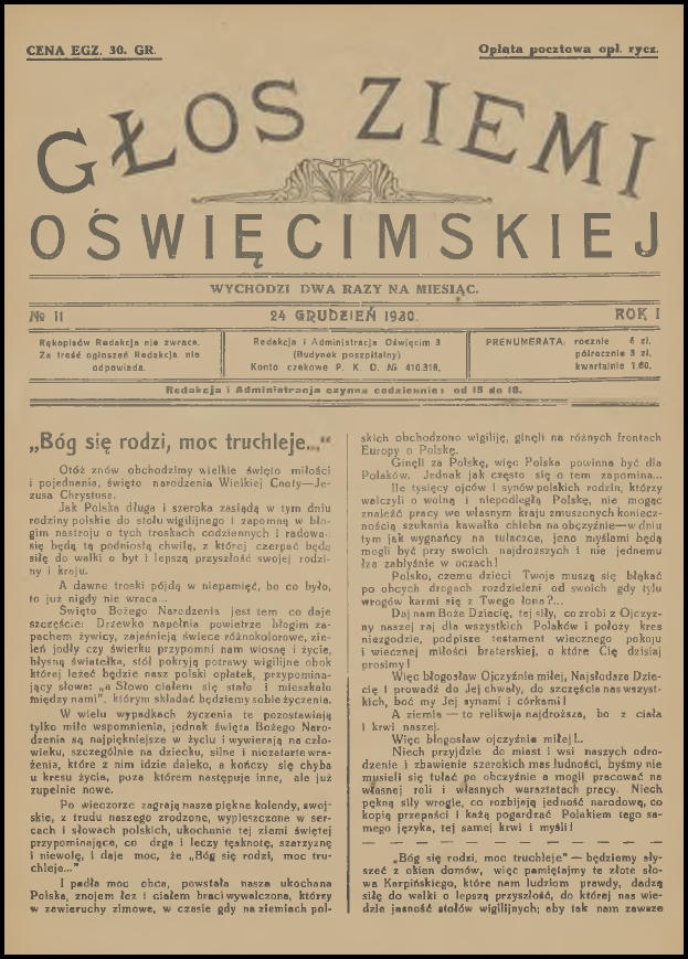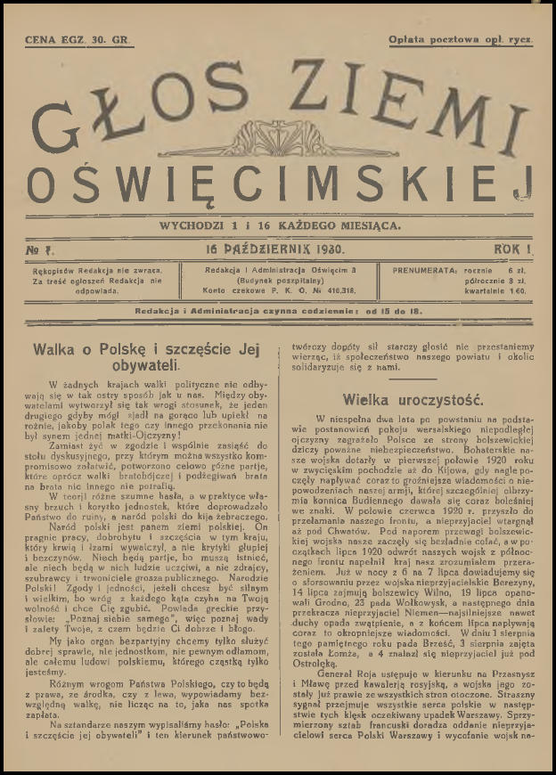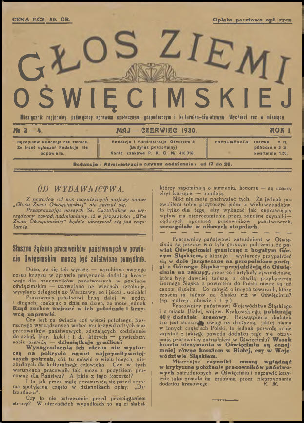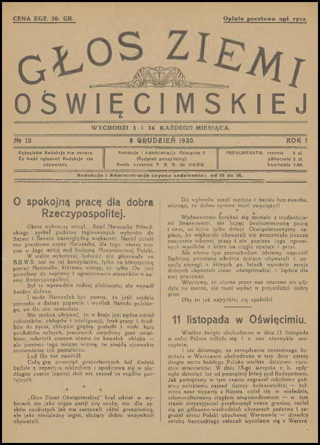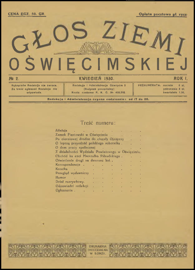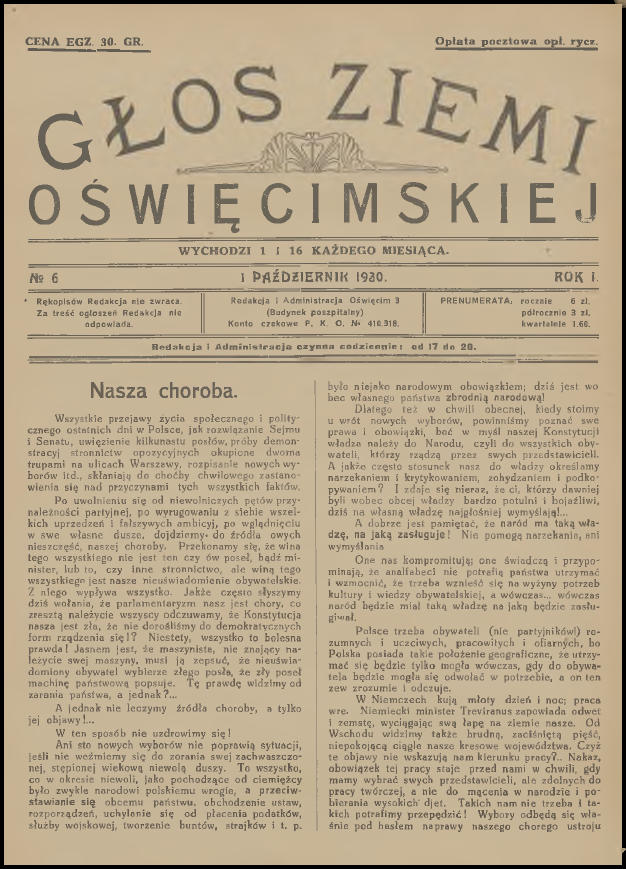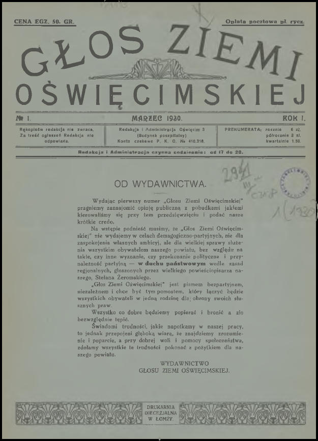 Wczoraj wieczorem dla relaksu, z kieliszkiem australijskiego wina w ręku, przeglądałem sobie zasoby Jagiellońskiej Biblioteki Cyfrowej. Jak to zwykle bywa przy tego typu aktywności, udało mi się natrafić na ciekawe publikacje, które wcale nie stanowiły celu moich poszukiwań. Tym razem były to cyfrowe wersje pierwszych jedenastu numerów „Głosu Ziemi Oświęcimskiej”. Już od dawna chciałem do nich dotrzeć, a tu proszę taka niespodzianka! Poza tym los również ułatwił mi nieco życie, ponieważ przy okazji zamieszczenia tego posta na blogu, miałem zamiar napisać krótkie wprowadzenie. Dwa tygodnie temu na stronie Muzeum Zamek w Oświęcimiu pojawiło się zwięzłe opracowanie na temat „Głosu”. Pozwolę sobie nie powtarzać się i podam bezpośredni odnośnik do niego (LINK). Aby ułatwić wszystkim zainteresowanym dostęp do wspomnianych jedenastu numerów (a tak na prawdę dziesięciu, ponieważ jeden jest podwójny), umieściłem je poniżej. Wystarczy kliknąć na przycisk „Pobierz” pod grafiką. Pliki i skany pochodzą ze strony Jagiellońskiej Biblioteki Cyfrowej (LINK) i znajdują się w domenie publicznej.