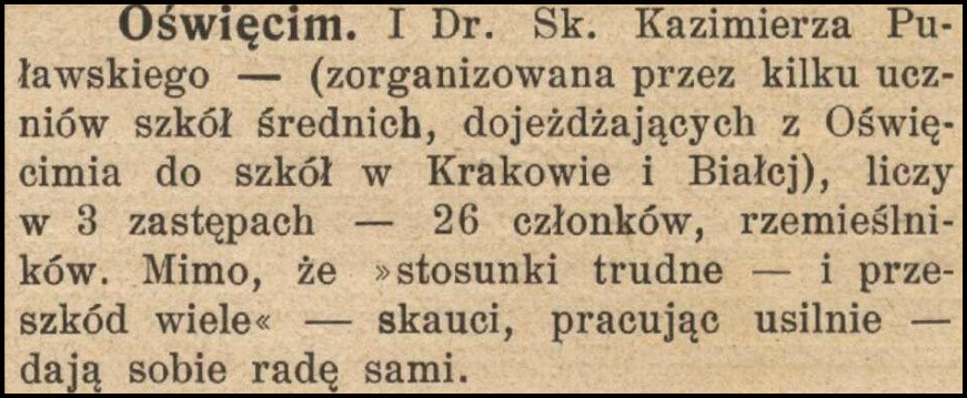Informacje o początkach ruchu skautowego w Oświęcimiu są bardzo skromne. Krótkie wzmianki na ten temat zawierają m.in. takie publikacje jak: wydana w tym roku dwutomowa monografia Oświęcimia, pt. „Oświęcim. Miasto pogranicza” (tom II, str. 206) oraz „80 lat Liceum Ogólnokształcącego im. St. Konarskiego w Oświęcimiu” (wyd. z 1995 r., str. 79). W obu przypadku nie ma żadnych odnośników do źródeł, a ponadto różnią się one jednym zasadniczym szczegółem – datą powstania pierwszej drużyny skautowej w Oświęcimiu. Padają daty: 1913 r. (monografia Oświęcimia) i jesień 1912 r. („80 lat…”). Która z nich jest właściwa? Postanowiłem sięgnąć do źródła z epoki. W numerze 9. (31.) czasopisma „Skaut” z 22 stycznia 1913 r. (źródło: archiwumharcerskie.pl) widnieje informacja następującej treści: